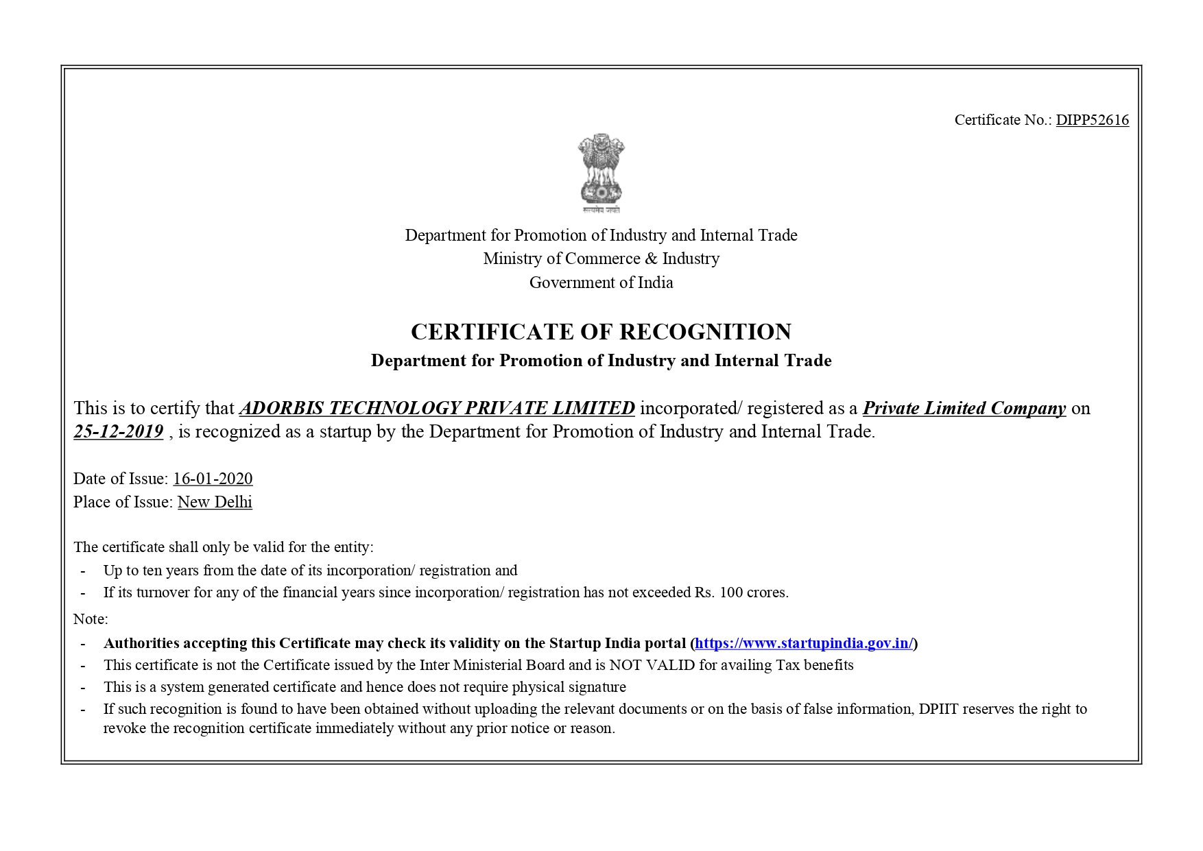 Recognized by the Department for Promotion of Industry and Internal Trade (DPIIT), Government of India, under the Startup India initiative. Recognition number: DIPP52616. Verify on Startup India portal ↗ View certificate (JPG) ↗